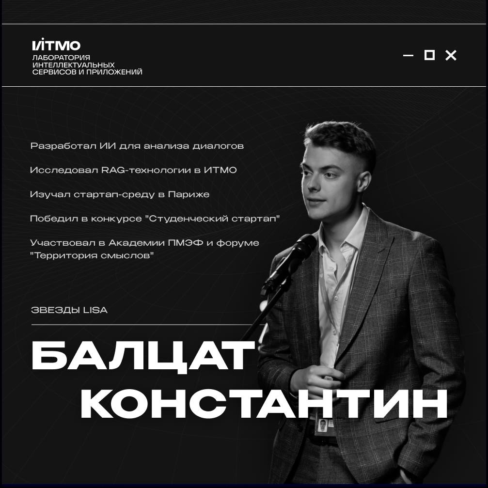 Работая в лаборатории с 2023 года, разработал инновационную систему, которая анализирует текстовые диалоги, помогает людям лучше понимать друг друга, предсказывает кризисные моменты в отношениях и предлагает пути их решения.