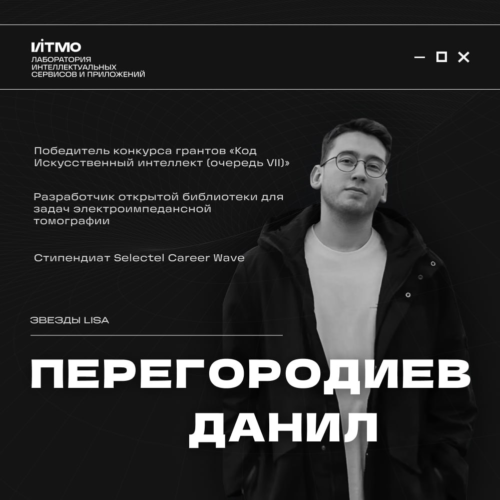 Данил Перегородиев, магистрант ФПИн, инженер LISA — член команды разработчиков, выигравшей конкурс грантов «Код Искусственный интеллект (очередь VII)» от Фонда содействия развитию малых форм предприятий в научно-технической сфере.